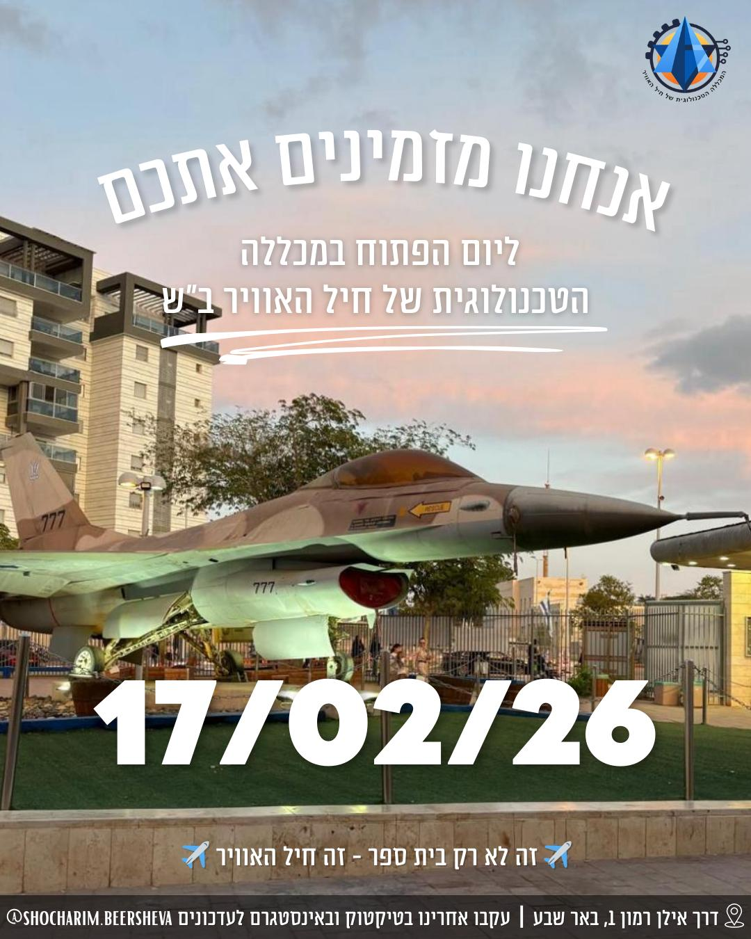 ההרשמה לבית הספר הטכני של חיל האוויר בבאר שבע נמצאת בעיצומה. לחצו על הכפתור על מנת להתחיל את התהליך!
